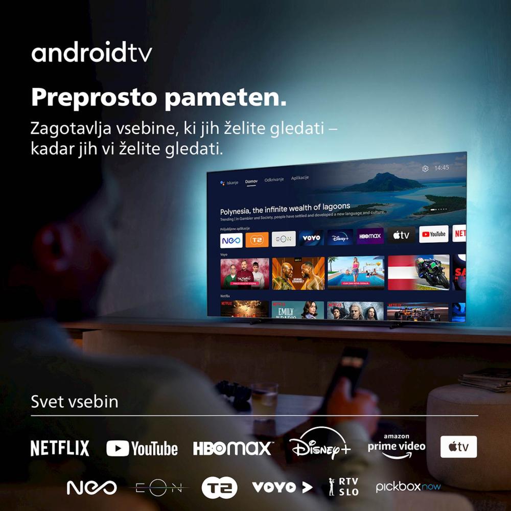 Pristna slika, kakršno ste si želeli – to vam nudi naš cenovno najdostopnejši televizor OLED. Odlična odzivnost med igranjem zagotavlja popolno doživetje. Vznemirljiv zvok oddaj, filmov in drugih vsebin. Kar koli vam je všeč, bo z osvetlitvijo Ambilight postalo le še boljše.