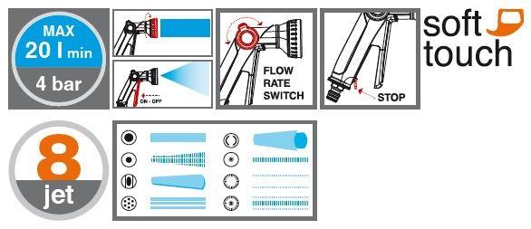 G.F. pištola za zalivanje in škrpljenje z osmimi različnimi tipi šob, ki omogočajo zalivanje katere koli površine, rastlin in cvetlic ali za čiščenje zunanjih površin.