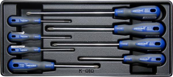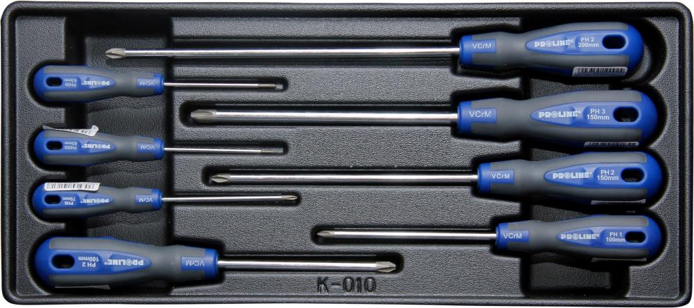 Predal orodja za kombinirane izvijače, set 8 kom. Vsebuje izvijače: PH0x75 mm (10161), PH1x100 mm (10162), PH2x100mm (10163), PH3x150 mm (10165), PH4x200 mm (10167), PH000x63 mm (10080), PH00x63 mm (10081), PH2x150 mm (10164). Velikost predala: 395x180mm.