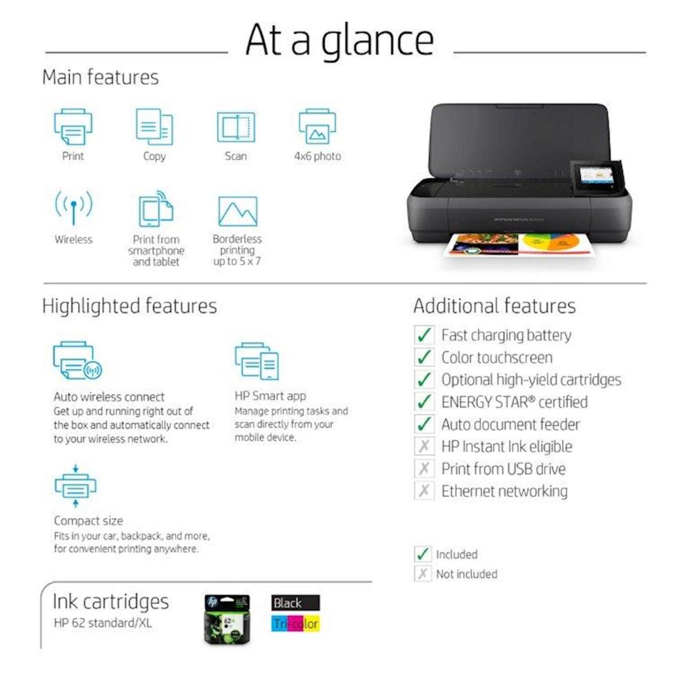 Tiskajte, skenirajte in kopirajte dokumente in kakovostne slike kjer koli – s prenosno napravo HP OfficeJet 250. Z izboljšano povezljivostjo ponuja najboljšo praktičnost in hitrost v prenosni enoti. Delo vam olajša 10-listni avtomatski podajalec dokumentov ter 6,73 cm barvni zaslon na dotik.