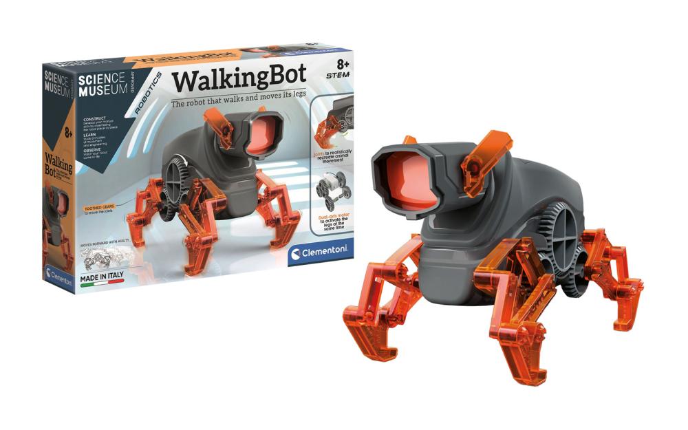 Navdušite svojega otroka nad znanostjo, mehaniko, inženirstvom in matematiko. Svet robotike ga bo naravnost očaral. Robot Walking Bot, Bionic, na baterije, Clementoni je edinstven robusten robot, ki sestoji iz 4 nog in električnega motorja, ki omogoča spontano premikanje. Ta edinstven robot ne bo nikoli padel s katerekoli površine zaradi kompleksnega mehanskega sistema, ki spremeni smer premikanja robota, ko le-ta ni več postavljen v ravnovesju. Robot se s svojimi gibljivimi sklepi premika in hodi kot pravi majhen štirinožni prijatelj. Set vsebuje kakovostno ohišje, vizir, gibljive sklepe, ušesa, zobnike, vijake, dvogredni elektromotor, prostor za baterije ter priročen in enostaven ilustriran priročnik. Robot deluje na baterije tipa 2 x 1,5 V AA/LR6, ki niso priložene. Izdelek je primeren za otroke starejše od osmih let.