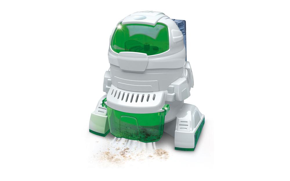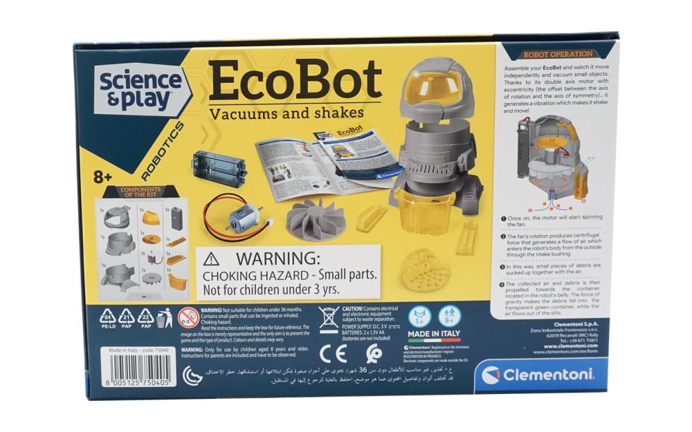 Navdušite svojega otroka nad znanostjo, mehaniko, inženirstvom in matematiko. Svet robotike ga bo naravnost očaral. Robot Ecobot, na baterije, je edinstven robot, ki mu je mar za čistočo. Sledite korakom v navodilih in sami boste sestavili pravega robota. Robot se s pomočjo vibracij prosto premika po prosotoru. Ob vžigu se aktivira še sesalna funkcija, ki majhne delce povleče v notranjost robota. Deluje na baterije 2x 1,5 V AA/LR6 (niso priložene).
