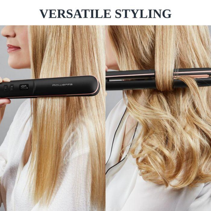 Ravnalec las Rowenta SF4620F0 »Liss & Cur« 2v1 ravnalec za popolno ravne lase in očarljive kodre. Spoznajte izjemno ravnanje z infuzorjem s papajo in keramičnima ploščicama za svilnato gladke rezultate z dodanim izjemnim leskom. Naša izjemna keramična obloga združuje učinek zmanjšanja naelektrenosti za brezhibno drsenje, da bodo lasje gladki, ukročeni in izjemno sijoči.