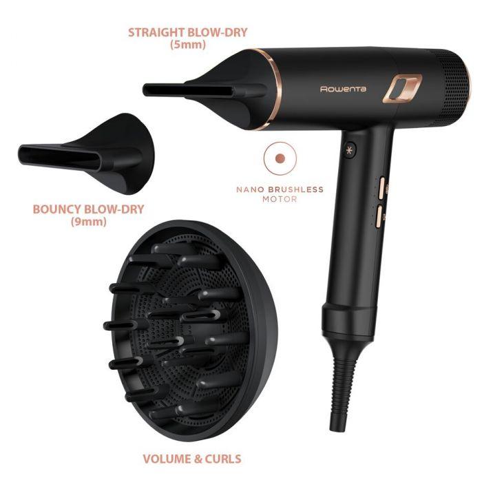 UNIVERZALNI NASTAVKI: 5-milimetrski koncentrirani zračni nastavek za sušenje ravnih las, 9-milimetrski koncentrirani zračni nastavek za puhaste in prožne lase ter difuzor za volumen za oblikovanje močnih kodrov in volumna.
