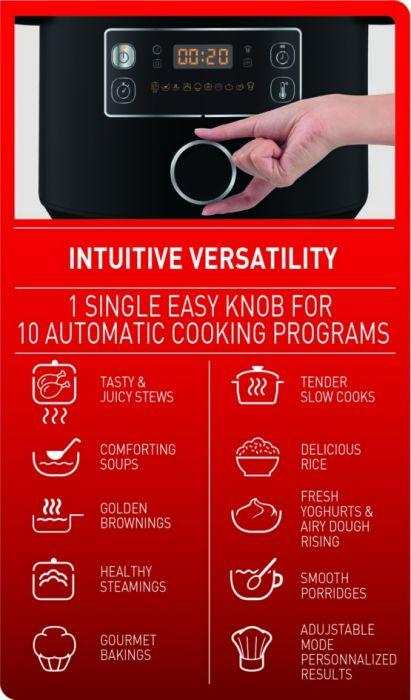 10 avtomatskih programov kuhanja. Zamenja vsaj 7 kuhalnih aparatov! Enolončnica, juha, cvrtje, kuhanje na pari, pečenje, sous-vide in počasno kuhanje, kaša, jogurt in fermentacija, pogrevanje, nastavljiv ročni način.
