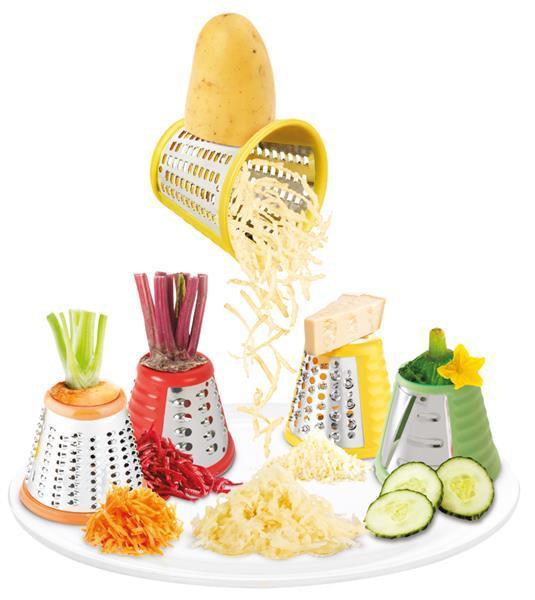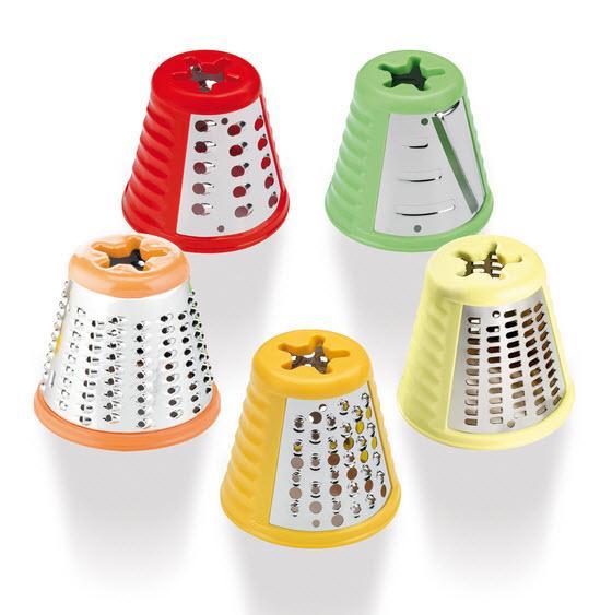 Vsestranski rezalnik in strgalnik Tefal MB756G31 »Fresh Express+« s priloženimi 5 stožčastimi nastavki omogoča rezanje na rezine, strganje in valovito rezanje.