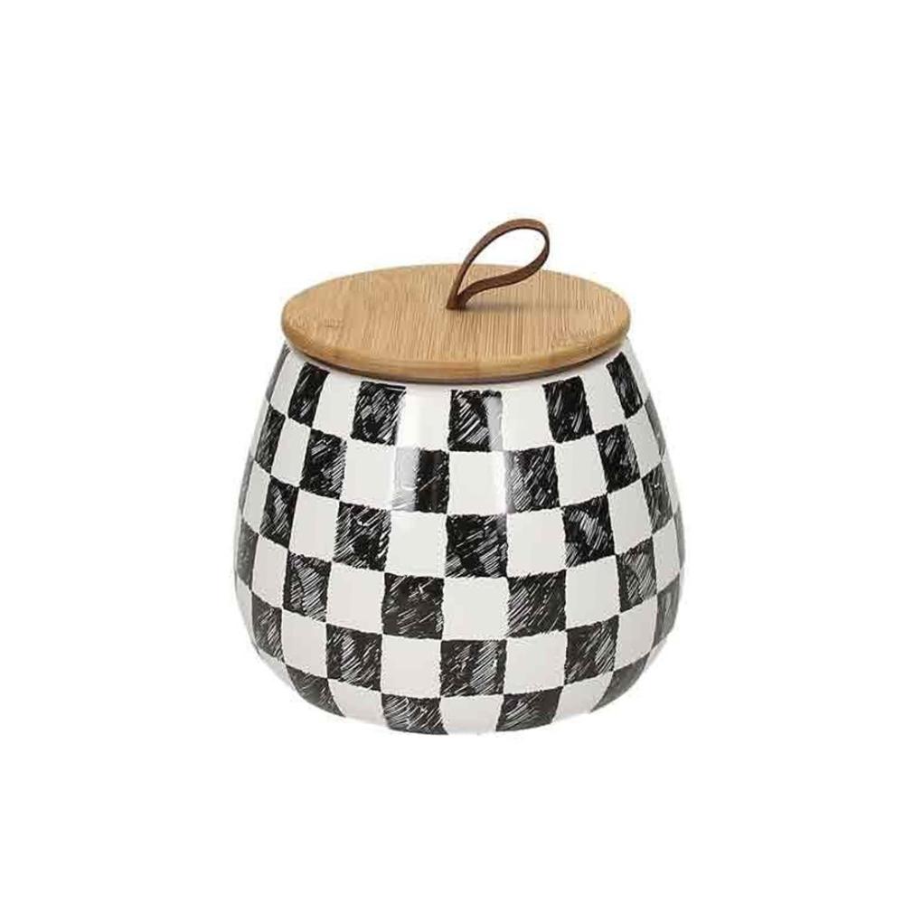Posoda za shranjevanje živil linije DOLCE CASA DAMA blagovne znamke Andrea Fontebasso meri 12 cm v višino, njen premer je 14 cm, skupna prostornina doze pa je 900 ml. Črno-bel karirasti vzorec v kombinaciji z lesenim pokrovom ustvarja brezčasni element, primeren za vse vrste okolja in domov. Posoda je idealna za shranjevanje suhih živil, za katere želite, da ohranijo svežino in aromo.