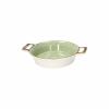 Okrogel pekač iz porcelana iz linije GLAMOUR UDON s premerom 20 cm in s skupno širino (z ročaji) 26 cm, v nežni zeleni barvi in z zlatimi robov, daje eksotični pridih vaši mizi. Pekač je idealen za pripravo toplih predjedi, glavne jedi ali raznih prilog. Lepo se poda še z drugimi elementi iste linije različnih oblik in velikosti, ki skupaj tvorijo edinstveno trendovsko celoto.