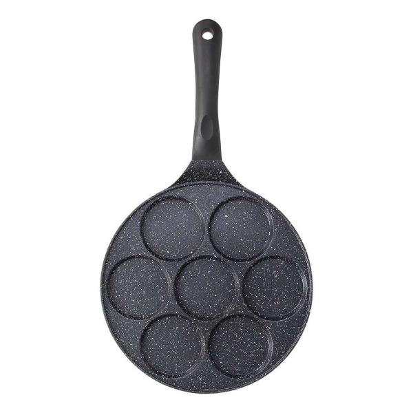 PONEV Z ROČAJEM IN OKROGLIMI KALUPI PREMIUM BLACK s premerom 26 cm je izdelana iz litega aluminija in notranjo marmorirano prevleko, ki preprečuje prijemanje (brez PFOA in niklja). Premaz je ojačan s trdnimi minerali, ki zagotavljajo odpornost na praske in dolgo življenjsko dobo. Ergonomski ročaj olajša rokovanje s ponvijo, bakelitna prevleka pa preprečuje, da bi se ta med uporabo segrel. Debelo dno je primerno za vse kuhalne površine, tudi indukcijo. 7 krožnih kalupov s premerom 8 cm, bo jedem dalo obliko kroga. Idealna je za pripravo palačink, jajc na oko, polpetov, mini pic, frtalj (z zelišči, s pršutom, sirom, šparglji, šunko…). Lahko jo pomijete v pomivalnem stroju.