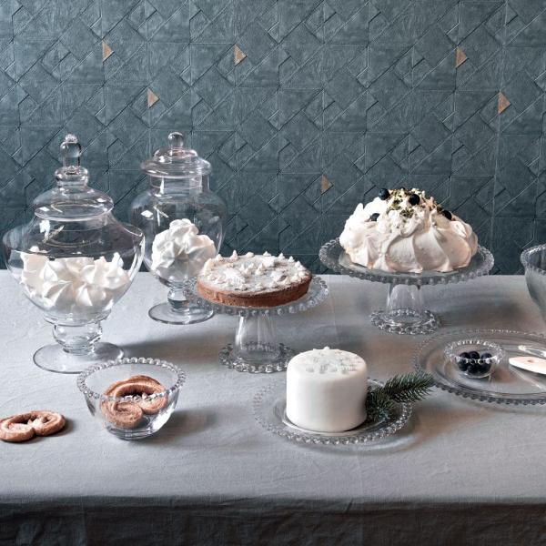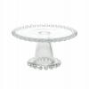 Steklena servirni krožnik na podstavku s premerom 21 cm in višino 12 cm linije Rugiada blagovne znamke Andrea Fontebasso. Minimalističen design z reliefnimi mehurčki na robu, ki ponazarjajo kapljice jutranje rose, ustvarja posebno eleganco te linije.
