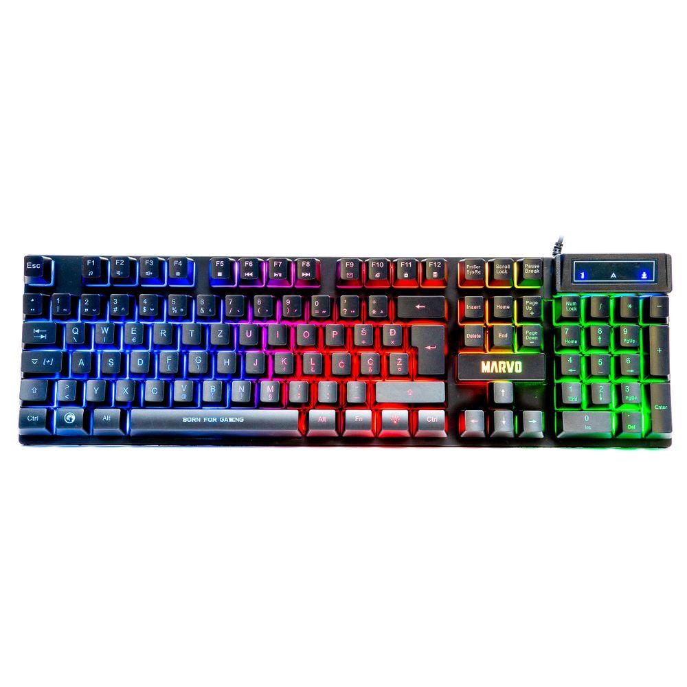 Komplet Marvo CM409 4-v-1 vključuje igralno tipkovnico, miško, slušalke in podlogo za miško.