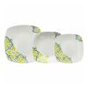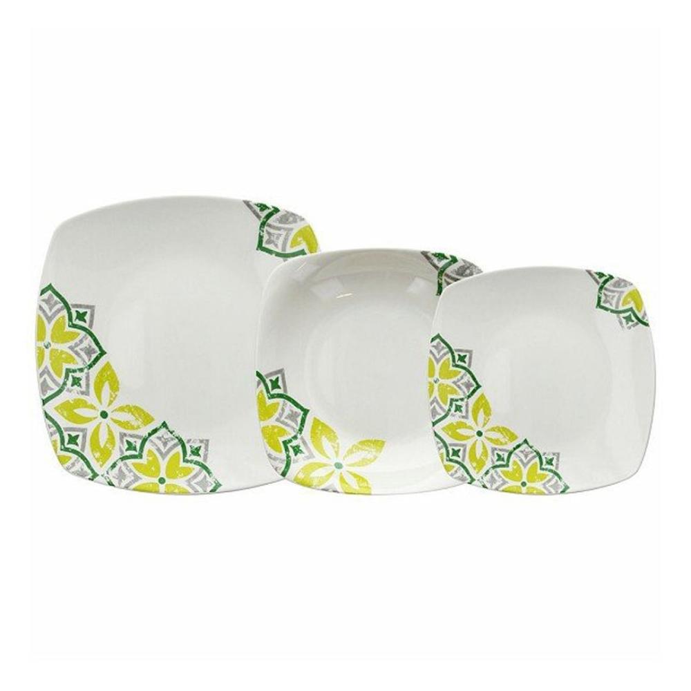18-delni set krožnikov iz porcelana Tognana, kvadratne oblike z zaobljenimi robovi, z zeleno-sivimi vzorci. Garnituro sestavlja 6 plitvih krožnikov 23 x 23 cm, 6 globokih krožnikov 19 x 19 cm in 6 malih desertnih krožnikov 18 x 18 cm.