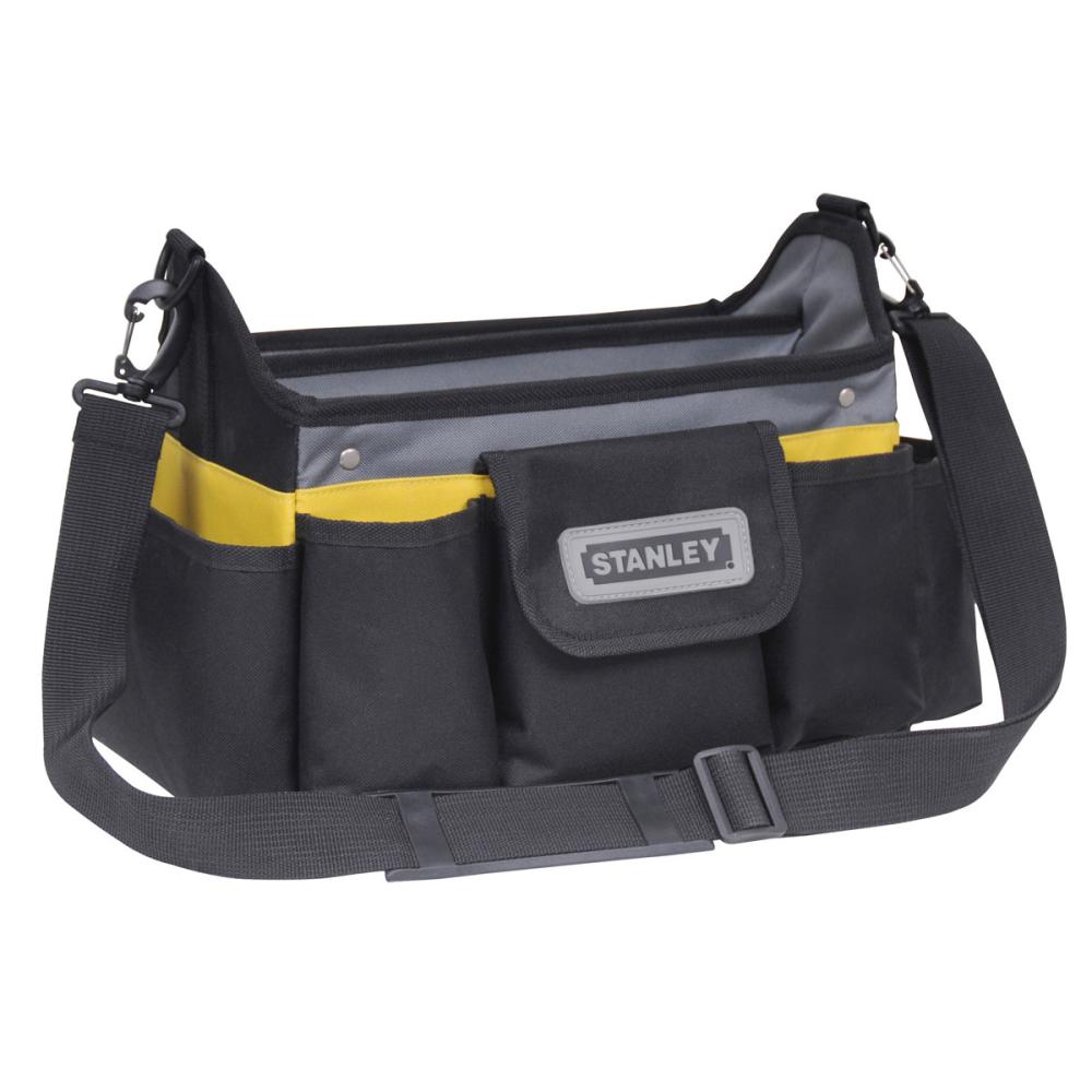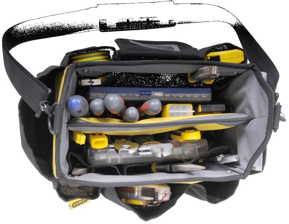 Stanley torba za orodje z zgornjim odpiranjem - Zgoraj odprta torba omogoča hiter dostop do ročnega orodja - Navpični žepi in zanke za shranjevanje omogočajo maksimalno razporeditev in lažji dostop do orodja - Majhen razdelek za shranjevanje vrtalnih konic in majhnih delov