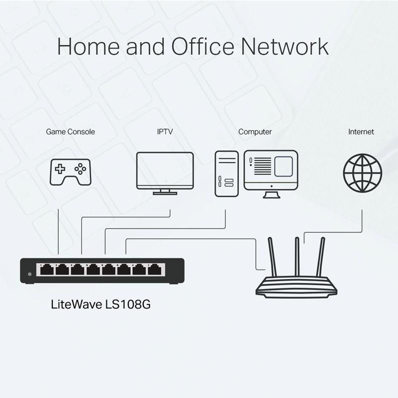 TP-LINK LS108G je 8-portno Gigabit namizno stikalo (switch). TP-LINK LiteWave serija unmanaged stikal omogoča preprost in cenovno ugoden način za razširitev ožičenega omrežja. So enostavni za uporabo in zanesljivi. S temi plug-and-play stikali lahko takoj razširite svoje omrežne povezave na več naprav. Ker vsa vrata podpirajo samodejni MDI / MDIX, vam ni treba skrbeti za vrsto kabla, ki ga želite uporabiti.