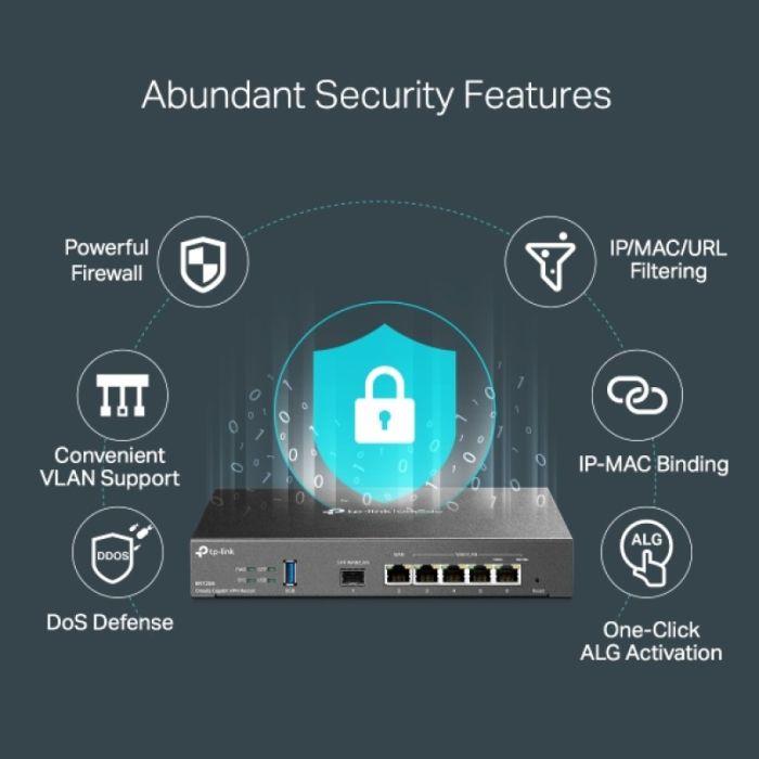 TL-ER7206 podpira različne VPN protokole vključno z IPsec, PPTP, L2TP VPN načini in lahko upravlja tudi s prehodnim prometom. Vgrajen strojni NAT pogon omogoča usmerjevalniku podporo in upravljanje do 100 LAN-to-LAN/Client-to-LAN IPsec VPN povezave, 50? OpenVPN*, 50? L2TP, in 50? PPTP VPN. Napredne VPN funkcije vključujejo DES/3DES/AES128/AES192/AES256 enkripcijo, MD5/SHA1 avtentifikacijo, NAT Traversal(NAT-T), Dead Peer Detection(DPD), Perfect Forward Secrecy(PFS).