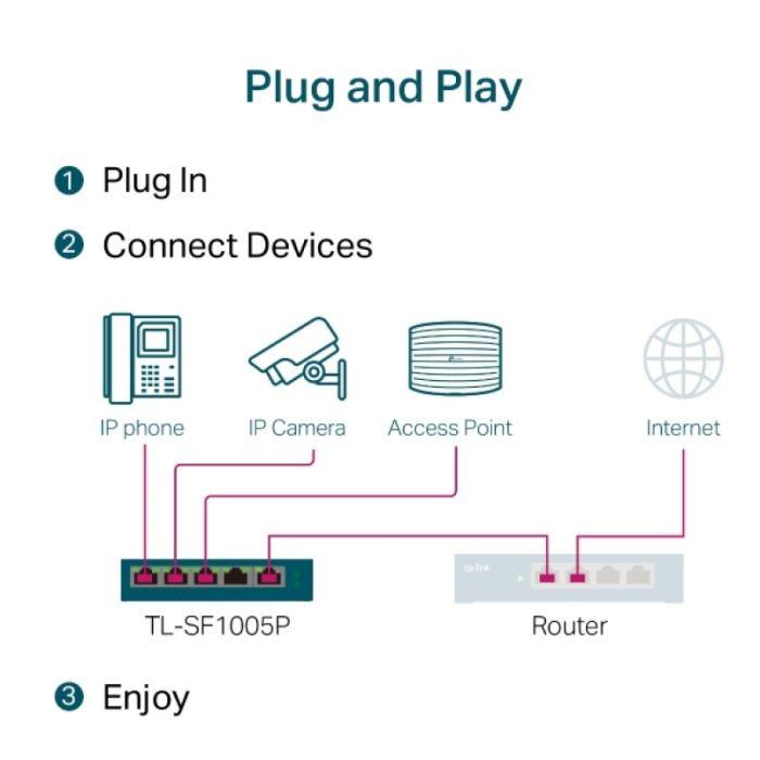 TP-LINK TL-SF1005P 5-Port PoE namizno stikalo-switch zagotavlja enostavno in hitro omrežno povezavo in enostavno postavitev IP kamer, IP telefonov, dostopnih točk ...
