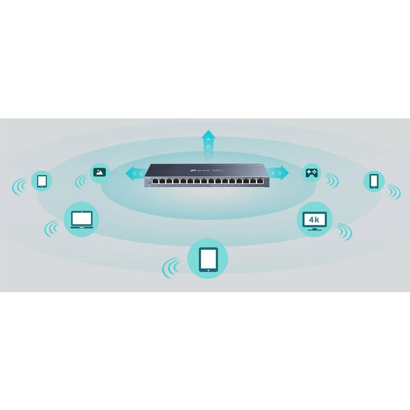 TL-SG116 je opremljen s 16 10/100/1000Mbps priključki, kar močno poveča zmogljivost omrežja in omogoča takojšnje velike datoteke. Tako lahko močni uporabniki doma, v pisarni, delovni skupini ali ustvarjalnem produkcijskem okolju zdaj hitreje premikajo velike datoteke, ki intenzivno uporabljajo pasovno širino.