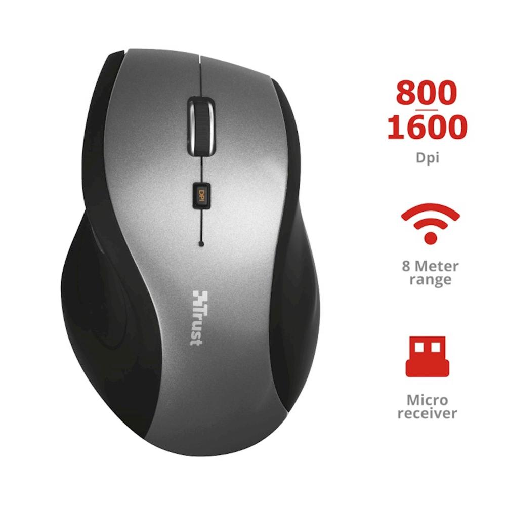 Miška je opremljena z natančnim optičnim senzorjem. 8m dometa. Mikro USB sprejemnik, ki ga lahko pospravimo v miško. Ergonomična zasnova in gumijasta prevleka, ki zagotavlja dobre oprijem. Z 2 stranskimas gumboma in gumbom za nastavitev občutljivosti(800-1600 DPI).