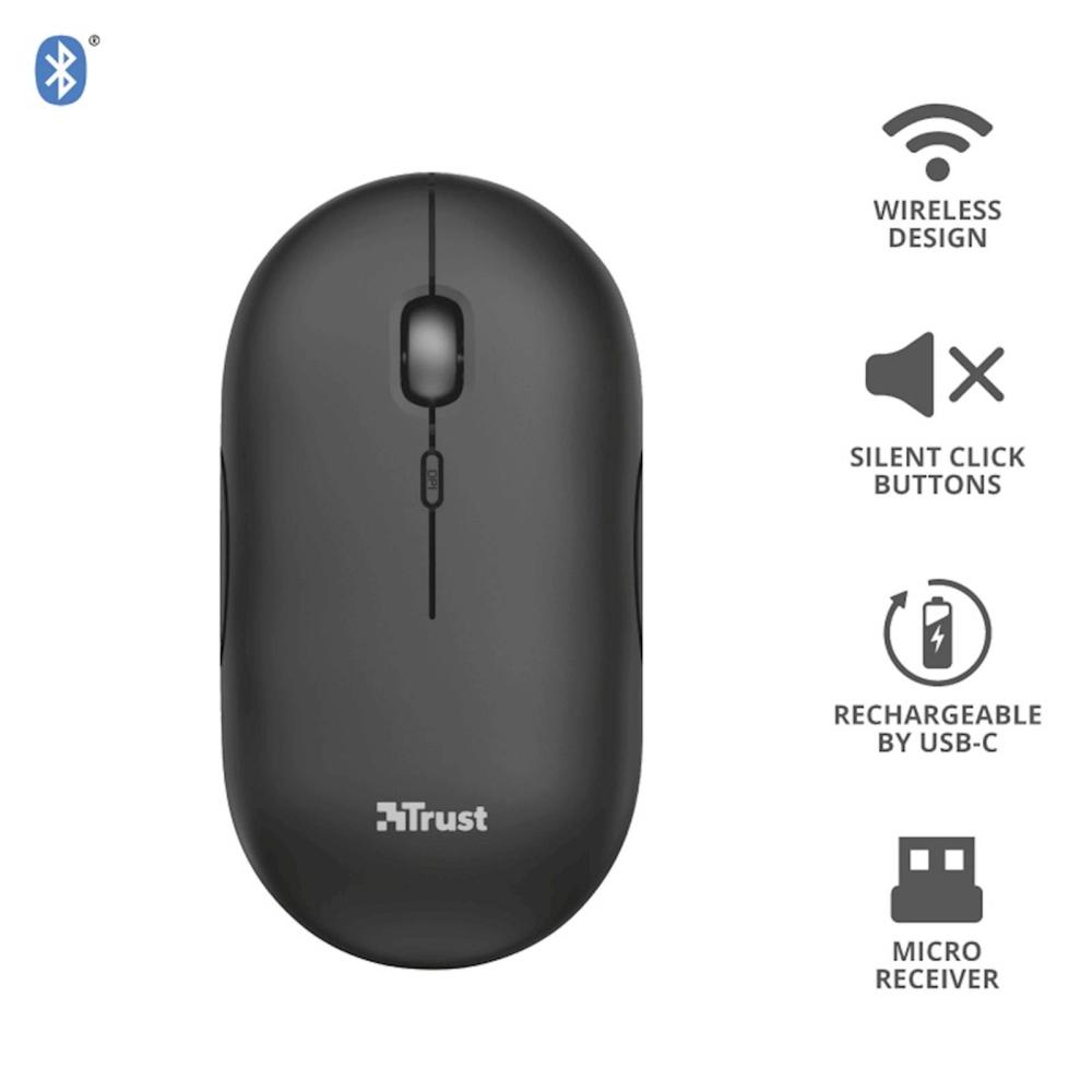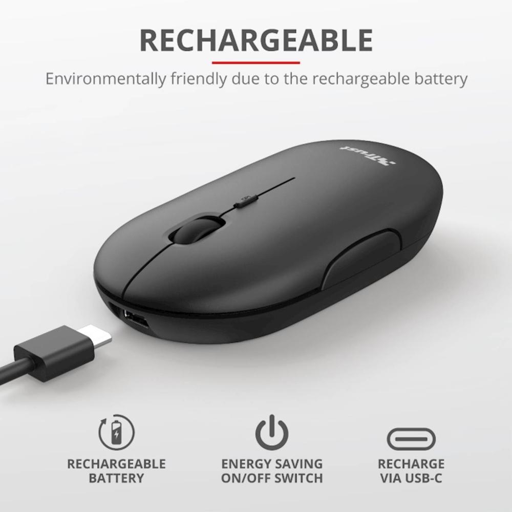 Zahvaljujoč minimalistični zasnovi Puck resnično izstopa. Z višino le 27 mm boste to miško zlahka nosili v torbi. Zaradi zaobljene oblike in gladkih robov je Puck v veselje do uporabe, dvosmerna oblika pa zagotavlja, da bodo tako levi kot desničarji uživali v tej ultra tanki miški. Zaradi polnilne baterije vam nikoli več ne bo treba kupiti baterij za enkratno uporabo. Ko miški zmanjka moči, jo preprosto povežite s priloženim kablom USB-C in še dobro. Prihrani tako denar kot okolje.