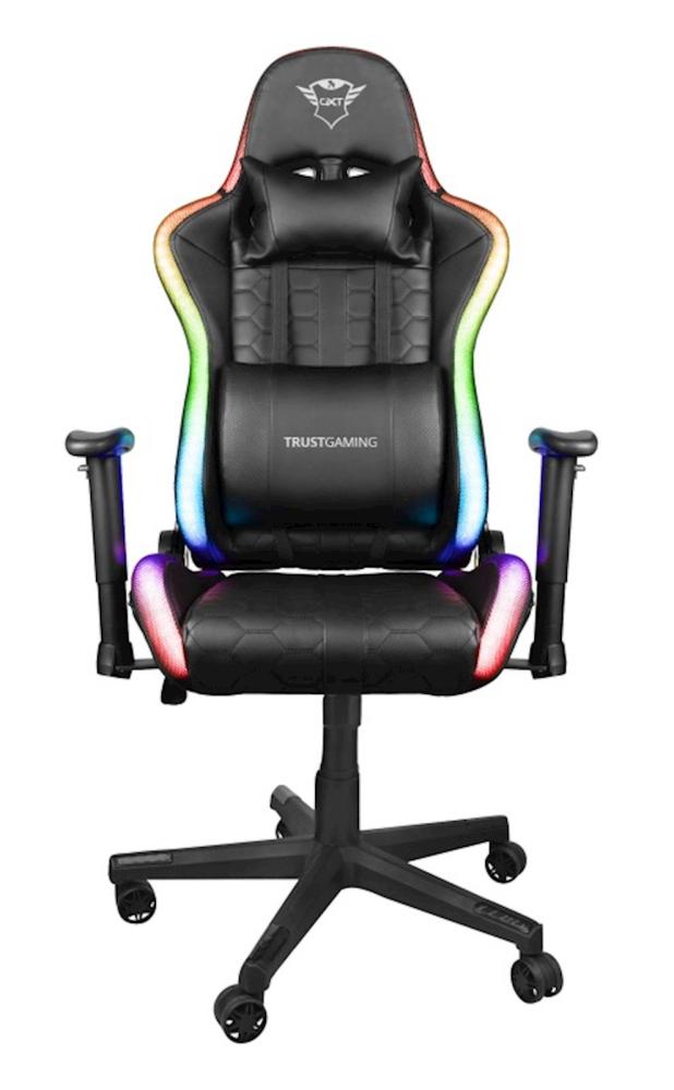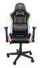 Stol za igranje iger z RGB LED-osvetlitvijo, zasnovan za ure udobnega igranja računalniških iger. Brezžični daljinski upravljalnik za spreminjanje nastavitev barv in učinkov ter za prilagajanje svetlosti. Dodatni žepi za shranjevanje daljinskega upravljalnika in prenosne baterije. Po višini nastavljiva, navzven/navznoter vrtljiva naslona za roki. Naslonjalo z možnostjo naklona do 175° in zaklepa.