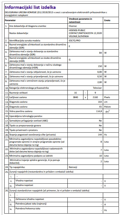 Diagonala ekrana (inch): 65 in, Diagonala ekrana (cm): 164 cm, Tip televizorja: QLED Smart TV, Ločljivost max.: 4K Ultra HD 3840x2160, Dolby Atmos, DTS Virtual X decoding, Uporabniški vmesnik: VIDAA Smart OS, Serija: E7Q PRO