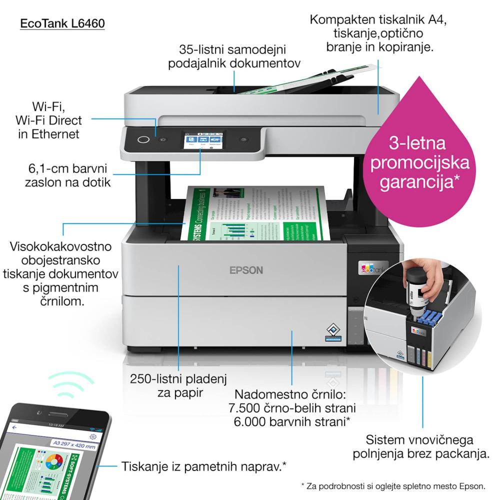 TISKANJE BREZ KARTUŠ! Naprava Epson L6460 ima bogat nabor funkcij, zasnovana je za domače pisarne in majhna podjetja ter zagotavlja izjemno nizke stroške tiskanja na stran ter izjemno hitro tiskanje. Pladenj za papir za vstavljanje s sprednje strani s kapaciteto 250 listov, 6,1-centimetrski zaslon LCD na dotik in samodejni podajalnik dokumentov za 35 strani vam omogočajo tiskanje brez prekinitev.