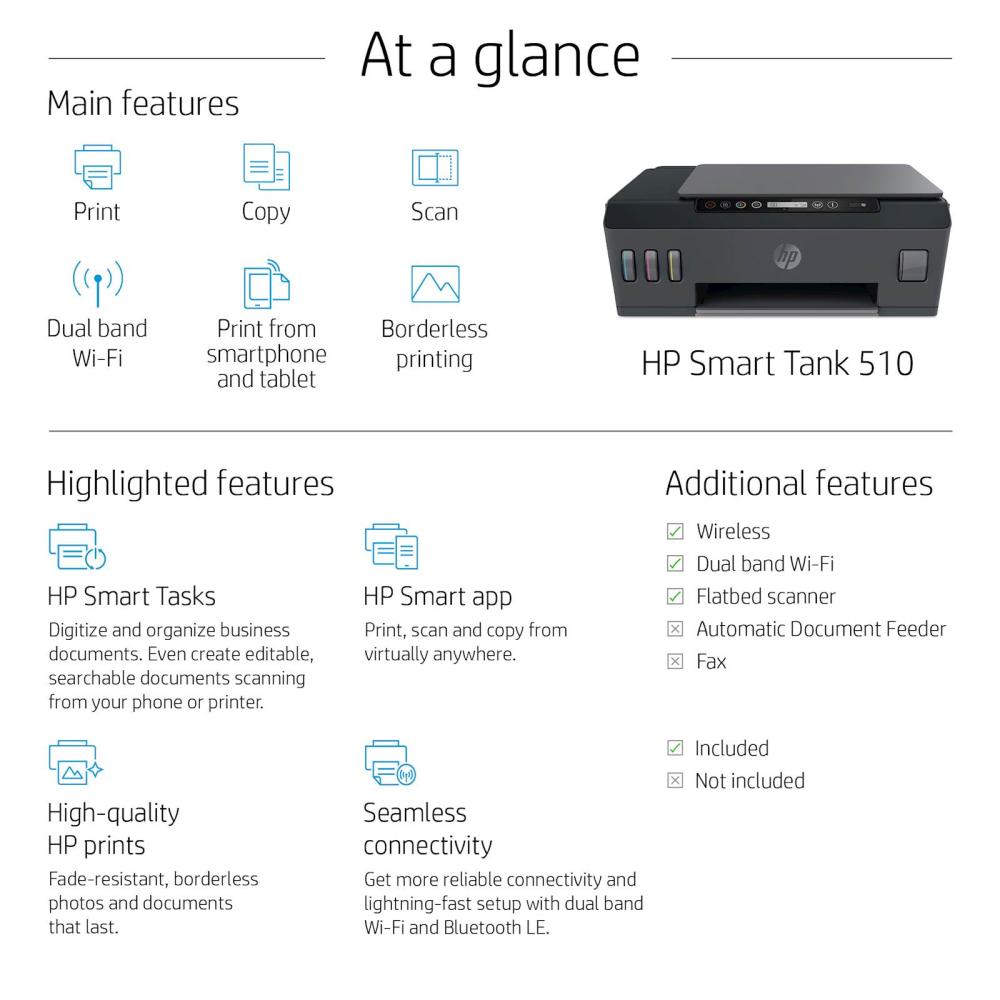 Nova multifunkcijska brizgalna naprava na stekleničke, HP Smart Tank 515 Wireless, vam zagotavlja kvalitetne izpise ter izredno nizek strošek tiskanja na stran. Ob nakupu tiskalnika dobite priloženo črno črnilo za 18.000 strani in barvna črnila C,M,Y za 8.000 strani. Naprava je primerena za domačo uporabo ter uporabo v manjših pisarnah. S pomočjo tehnologije HP ePrint, lahko tiskate dokumente s pametnih telefonov ter tablic.