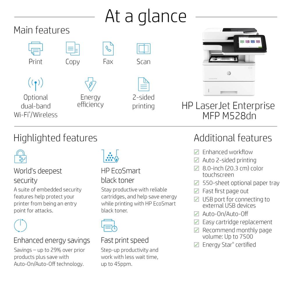 Izredno zmogljiva namizna mrežna večfunkcijska laserska naprava HP LaserJet Enterprise M528f, ki je zasnovana za varno in učinkovito upravljanje poslovnih rešitev. Naprava omogoča tiskanje, kopiranje, faksiranje, pošiljanje e-pošte ter dvostransko skeniranje v enem prehodu. Konkurenčno prednost predstavljajo hitrost, profesionalni izpis, visoka kapaciteta papirja, več spomina, vgrajeni spenjalnik, ter možnost tiskanja iz kjerkoli si želite. Velik 20,3 cm barvni zaslon na dotik, vam omogoča lažji dostop do aplikacij.