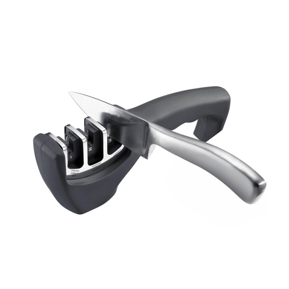 Zahvaljujoč proti zdrsni gumijasti podlagi je brusilec trden in stabilen, ergonomsko oblikovan ročaj iz polipropilena pa olajša rokovanje z njim. Uporabljajo ga lahko levičarji ali desničarji. Pospravite ga kar v kuhinjski predal. Ni primeren za pomivanje v pomivalnem stroju.